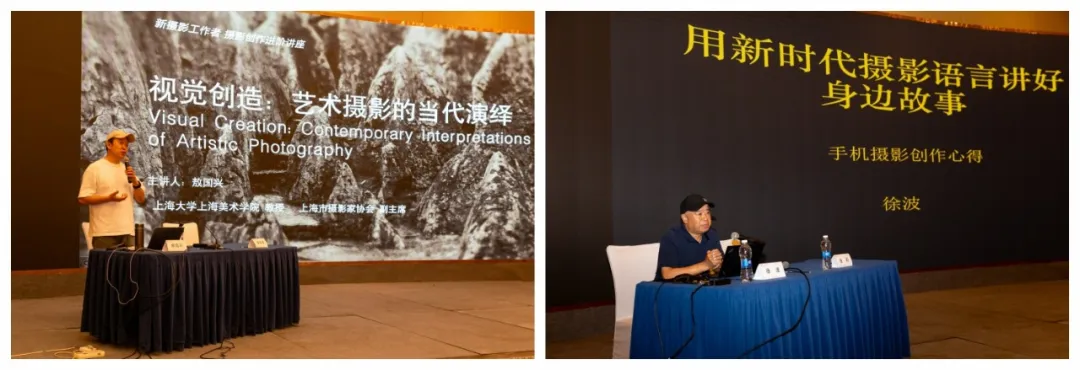 中国摄影教育委员会委员、上海大学上海美术学院教授敖国兴以《视觉创造:艺术摄影的当代演绎》为题,通过对艺术摄影史中具体作品的赏析,化抽象为具象,分别讲解新材料、新理念、新角度带来的应用创新。摄影不只是再现现实,更是一种视觉创造,创新是摄影艺术的内在要求,提醒着各位学员在未来的创作中,要深入思考,精心构思,形成独特的个人艺术风格。第十一届中国摄影金像奖获得者徐波以《用新时代摄影语言讲好身边故事》为题,向学员们分享了自己多个专题作品,他从生活入手,讲述如何记录生活中的百姓故事,结合自己的经历和感悟,让学员们感受到摄影作品背后的生活意义和社会价值。他表示“贴近真实的生活,这样才能创作出接地气、有温度、有筋骨、有意义的作品。”