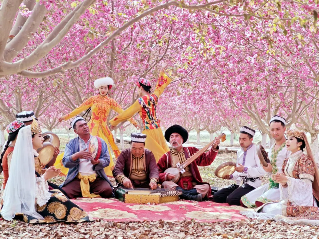 2025年4月15日,非遗传承人在新疆阿克苏地区阿瓦提县刀郎部落景区表演国家级非物质文化遗产——刀郎木卡姆。近期,刀郎部落景区以“花”为媒,开展杏花节、消费季、非遗展演等活动,吸引众多游客打卡游玩,景区人气持续攀升。近年来,阿瓦提县大力推动非遗人才培养和民俗文化传承,通过开展非遗文化进景区等系列活动,助力文化和旅游深度融合发展。