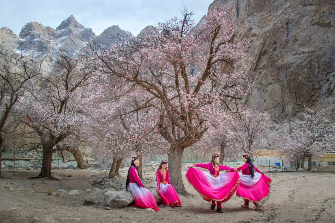 2024年4月摄于新疆塔什库尔干县,作品展现塔吉克族姑娘在杏花树下翩翩起舞的欢乐场景。