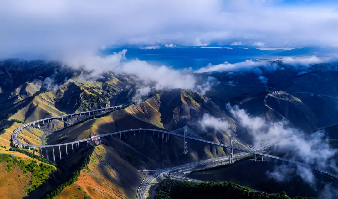 2023年9月,新疆伊犁霍城县果子沟牧场,晨曦中的果子沟大桥与赛里木湖沐浴柔光。一图双景横跨两州,云雾间桥似天路,车如穿行,湖水澄澈。这座“一带一路”枢纽,既是致富要道,亦是艺术珍宝,绘就绝美画卷。