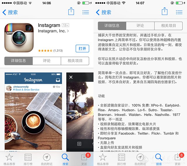但是,有些运营商的手机用户必须在Wi-Fi状态下才可以使用Instagram的社区。此外由于前段时间LINE的悲剧,也有传言说Instagram也会被封,当然只是一个传言。只是最近又有Instagram从几个国内安卓主流商城(比如豌豆荚)下架的消息,不过苹果用户目前没有受到什么影响。还是衷心希望Instagram不要悲剧吧。