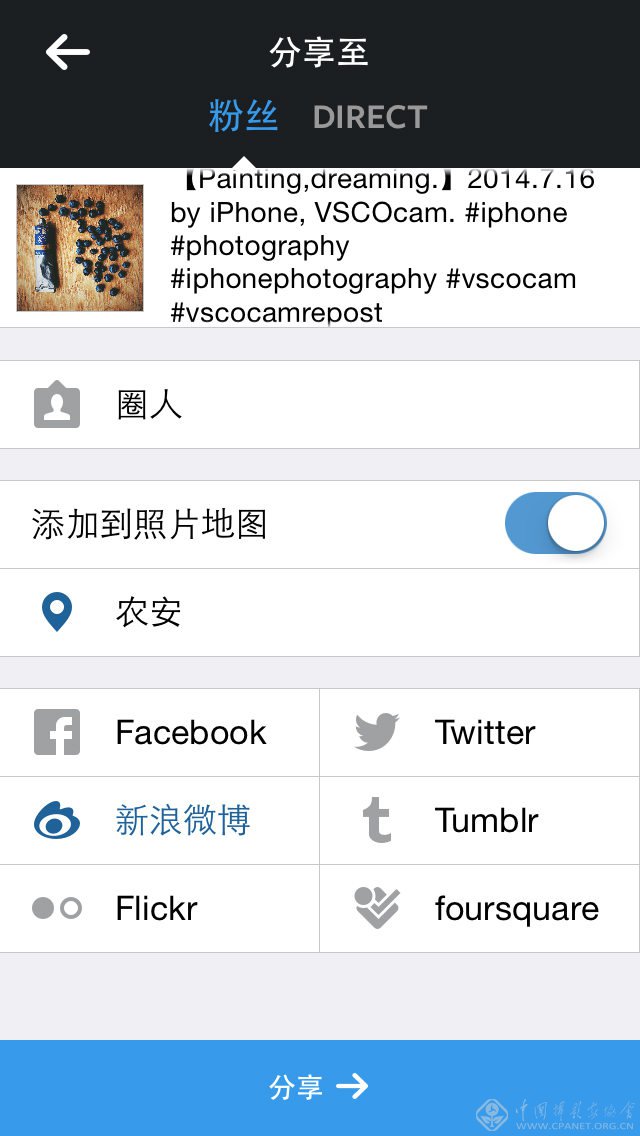 当然Instagram另一个吸引人的地方就是它的“分享社区”功能,你经过处理的照片可以立即分享到Instagram社区上。可以添加描述、标签、地点,也可以同步到Facebook、Twitter、新浪微博等其他社区。全球使用Instagram社区的人非常之多,国内外的明星也有很多在使用。可以关注一些自己感兴趣的人,浏览图片开阔眼界还是比较有趣的。