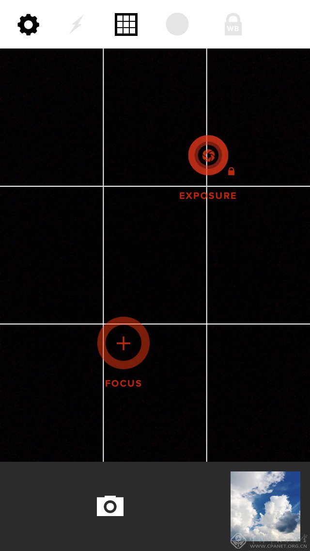 VSCOcam可以直接将图片导入到LIBRARY中进行处理,也可以启动拍照工具获得照片。VSCOcam拍照功能的一大亮点是,点击屏幕会出现一个红色的“对焦+测光点”。如果用两个手指将红点做分离动作,一个红点就会变成两个,一个单独负责测光(EXPOURE),一个单独负责对焦(FOCUS)。双击其中一个红色点,都可以对测光/对焦点进行锁定。解锁也很简单,移动一下其中锁定的点就会自动解锁了。此外,VSCOcam的照相版块还有裁剪、辅助线、白平衡锁定、水平仪等功能,功能不俗(虽然很少用VSCOcam进行拍照)。