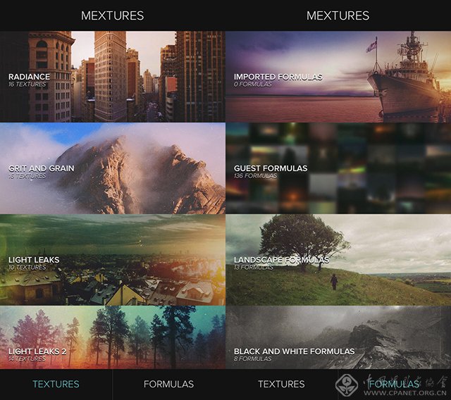 如果你缺乏想法,不知道如何组合才好,Mextures也会提供FORMULAS(公式)。公式里会提供一些摄影师推荐的滤镜公式,也会更新一些季节性的公式。运用这些公式并非一步而成,它依旧会呈现完成的图层,每个图层里如何调节都会展现出来,你可以在公式的基础上再进行调节,从而达到自己最满意的效果。当然,除此以外Mextures也会有基础参数的调节。