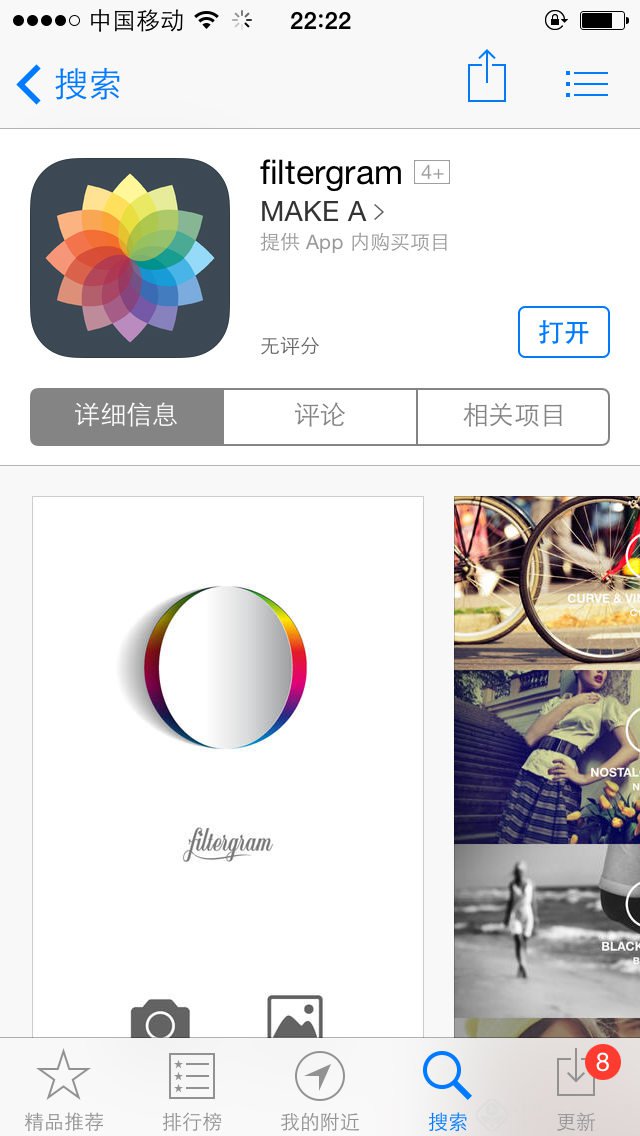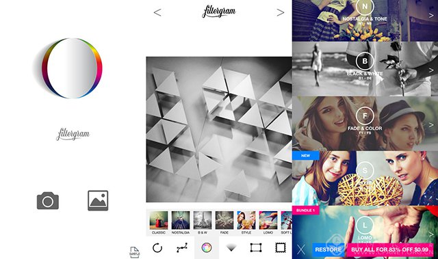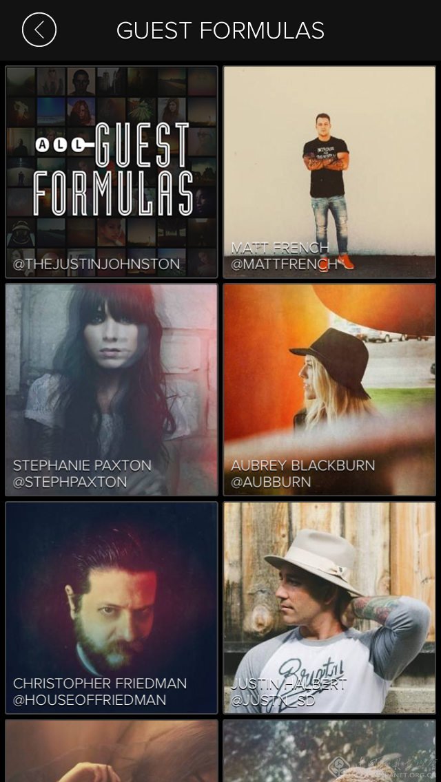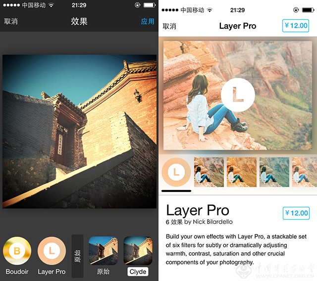 filtergram同样是一款收费应用。它与VSCOcam以及Afterlight有很多相似之处。在基础参数调节页面与Afterlight几乎是一样的版式,而在色彩滤镜效果上则更多能看到VSCOcam的影子,提供诸多效果出色的滤镜,而更多的滤镜同样需要收费。在商店滤镜介绍页面,你会不得不承认这与VSCOcam的STORE一样嘛。