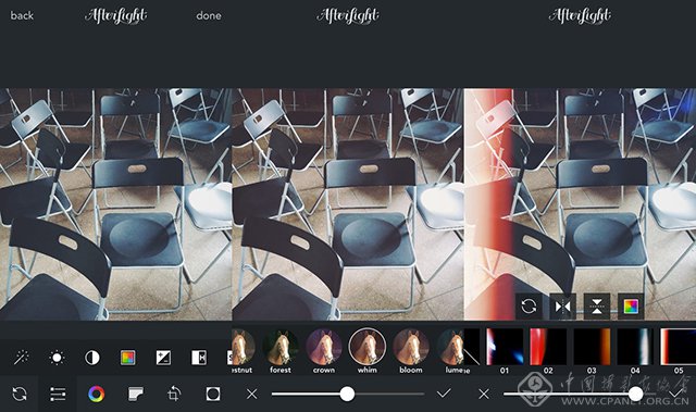 Afterlight也是一款评价很高的综合性滤镜应用,各方面素质都十分优秀。不仅可以进行拍照,也可以直接导入图片。Afterlight的拍照功能并非评测者们所说的很弱,其实效果也不错,同VSCOcam一样,具有测光点和对焦点可以分离各自对焦的性能,以及白平衡锁定等。此外,拍照界面的右下角还有3秒/7秒/10秒的“延迟拍摄功能”。