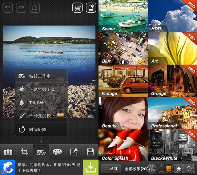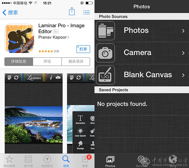 Photoshop Express在App Store很难找到,我也是通过第三方的快用苹果助手下载的。目前版本更新到3.3,仅供美国区的App Store,如果想试用可以像我一样,在第三方下载(比如快用苹果助手)。其实Photoshop Express并没有Laminar Pro那样专业,功能不是很复杂,也有一些滤镜以及边框等新奇功能,算是和Laminar Pro之辈不同风格的App。如果想畅快地使用图层、蒙版等高级功能,还是需要Laminator Pro。