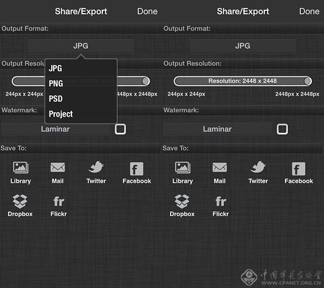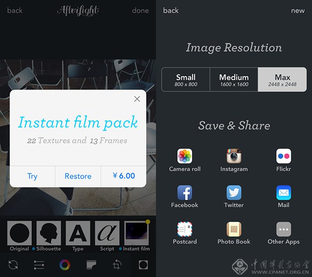 处理完毕后,Afterlight的导出方式提供三种不同大小的导出方式,最大可提供2448×2448的图片格式(即原图大小)。Afterlight同样是一个十分优秀的综合类后期应用,虽然惊艳的地方不多,但是综合、全面,也是十分受欢迎。