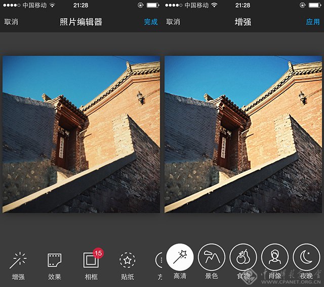 拍照功能更为简单纯粹,没有自定义参数的调节,基础参数调节更为基础。比如调节的第一项就是增强选项,简单说就是增加了场景模式,比如景色、食物、肖像等功能,可以一步向你自己想要的场景风格靠拢。Aviary的特点就是增加了去红眼、增白、模糊、去瑕疵、装饰文字的功能,一看就知道,这个应用似乎更适合妹子来用。