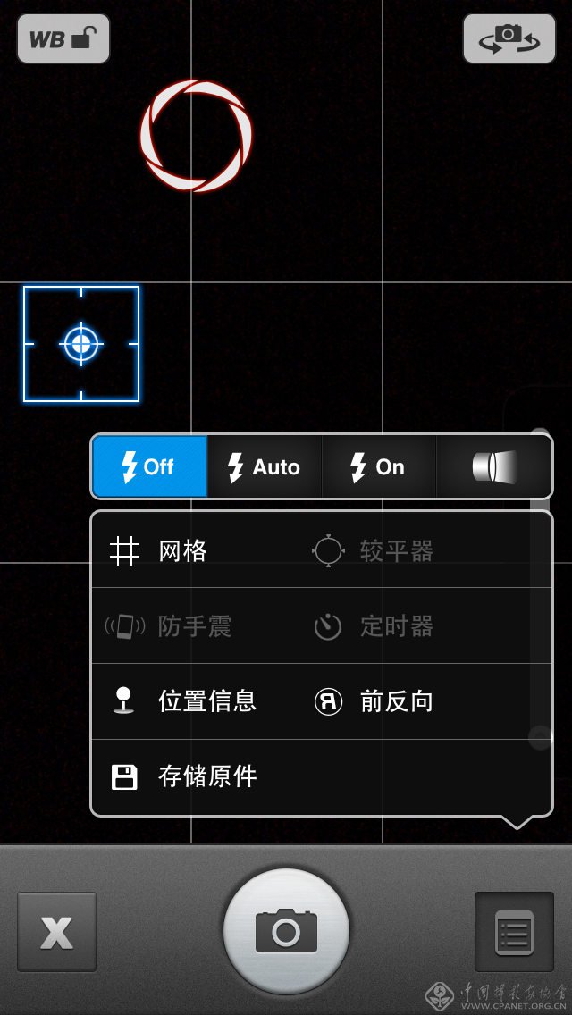 Rookie本身的拍照功能也很强大,除了基本功能外,还可以使用水平仪、定时器、白平衡锁定、对焦/测光点分离、防手震等,闪光灯功能中可以保持手电筒开启(在一些应用中有这种应用,在黑暗环境下会有很大作用),并且能够实时显示拍摄参数(ISO以及快门时间)。此外也可以实时运用一些滤镜。