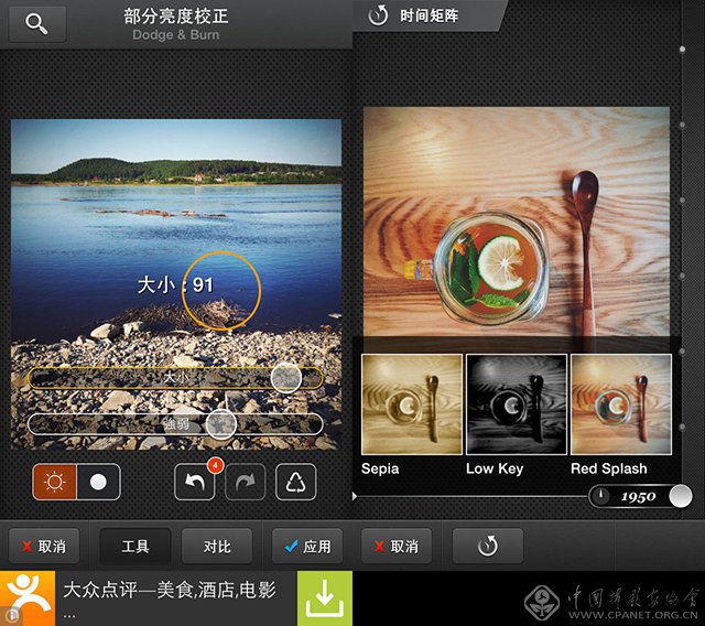 除了Fx特效工作室以外,Picsplay还有其他独特的工具,比如色彩特效工具,部分亮度校正,时间矩阵。其中“部分亮度校正”类似于Snapseed的点控制工具;时间矩阵则是Fx特效工具的另一种表现形式,即按照年份排列滤镜,从1950年到现在,每一个年代都有相应的滤镜,使用者可以上下拖动选择年代从而选择滤镜,十分有新意。
