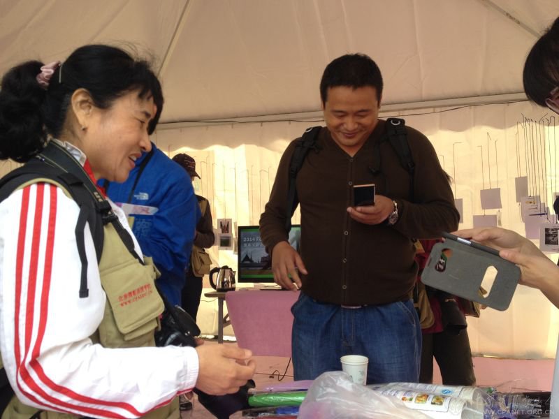 这样一场盛宴,成立不久的中国摄影家协会新媒体网站群,也早早来此宝地,为自己站地吆喝。在柴油机厂A4-A5之间的帐篷中,三网联手打造的“轻影展”、纪念品,在开展的第一天1个小时内就被热情的影友,几乎哄抢一空。下午赶来的新浪网助理总编辑、新闻中心图片总监严志刚,在抢到自己心仪的作品后,发朋友圈广而告之,称赞展览有新意。