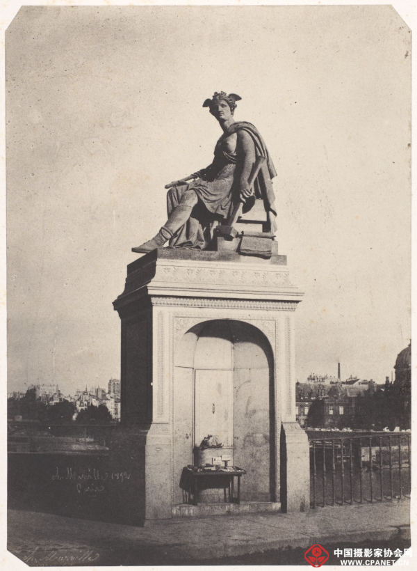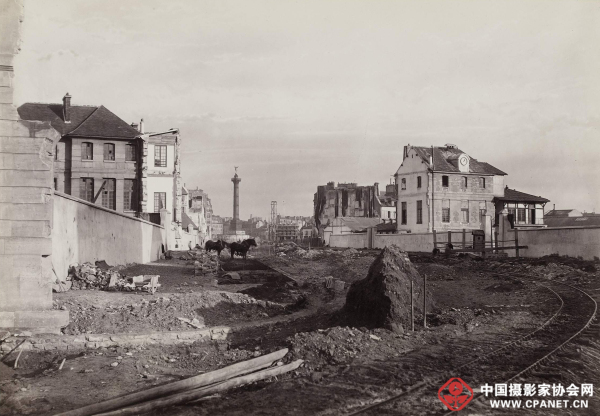 学者顾铮在其撰写的《世界摄影史》(浙江摄影出版社,2006 年)中写到摄影与城市文化的联系时,最先提到的就是马维尔,他在文中写到:“马维尔的摄影意图明确,很有章法。比如在拍摄一条将要重新修建的马路时,他会从老马路两端的两个方向各拍一张,然后在十字路口再拍一张。此后,他还会拍摄修建中与修建后的马路照片。通过这种方法,他为巴黎市政府保留了比较完整的视觉文献资料。”马维尔通过这种方法拍摄的影像中,最为经典的当属1871年的《巴黎公社起义前后的巴黎市政厅》。