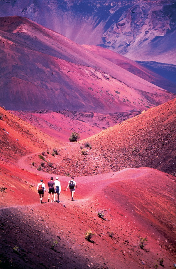 夏威夷火山国家公园:夏威夷火山国家公园位于希洛(Hilo)西南部30英里(48公里)的位置,这里坐落着基拉韦厄火山(Kilauea Volcano),地球上最活跃的火山之一。亲眼目睹创造和毁灭并存的难忘奇观让本公园成为夏威夷最热门的旅游景点之一,以及本地人眼中的神圣地方。成立于1916年的公园占地333,000英亩(1335平方公里),从茂纳洛亚火山(Maunaloa)山顶延绵到海洋。这里,您可沿着150英里(241公里)长的路径徒步穿过火山口、灼热的沙漠和热带雨林,以及博物馆、岩画、能走进的熔岩通道和两个活火山:茂纳洛亚火山(最后一次喷发发生在1984年),和基拉韦厄(自1983年1月3日起连续喷发)。该公园在1980年成为联合国教科文组织世界生物圈保护区,并在1987年被列入《世界自然遗产名录》,使它非凡的自然多样性得以承认。基拉韦厄火山有时被称为“全世界唯一可开车进入的火山”。这座火山每天产生250,000-650,000立方码(191,138-496,960立方米)的熔岩,足以铺好一条长20英里(32公里)的双车道公路。到1994年1月为止,夏威夷大岛已经产生了491英亩(1.9平方公里)的新土地。目前的喷发可能持续100年或明天就停止。居住在这里的火山女神佩蕾是难以捉摸的。欣赏基拉韦厄火山炙热的熔岩流入大海是惊心动魄的景象。