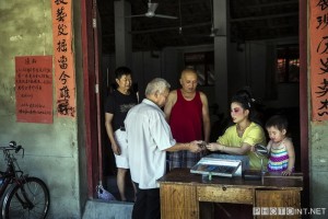 2014年6月,四川德阳民间川剧剧场门口,演员严玉环一边化妆一边卖戏票。