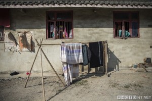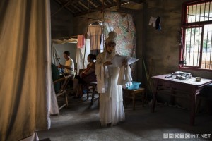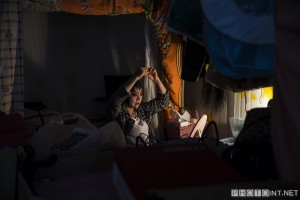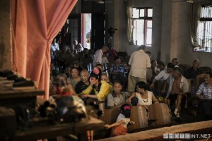 四川德阳几名演员拥挤在一间临时住房,也是演出前的临时化妆间。旦角蒋秀芳在自己床前化妆。