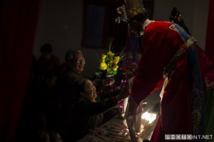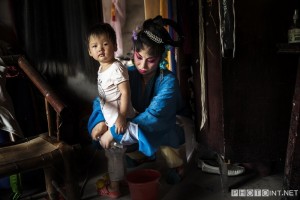 四川德阳旦角演员严玉环戏前给孙儿穿衣。