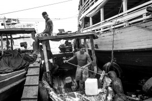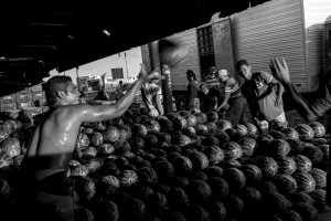 桑塔伦小镇港口的人们忙着卸下过往船只运来的西瓜。