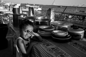 河边露天餐馆正值休息时分,小童眯起眼睛露出天真的笑脸。