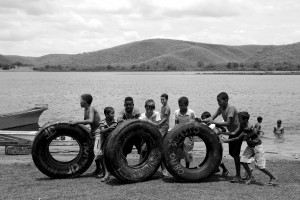 桑佛兰西斯科河畔,孩子们把大轮胎当作玩具。