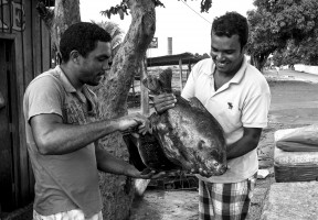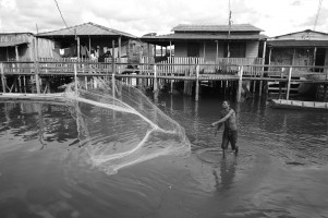 伊塔伊杜巴小镇的居民在高脚屋旁的河中捕鱼捞虾。