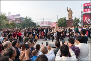 这些照片构成了一种线性的历史叙事,雕像作为近乎不变的背景,见证了一度被其紧紧控制的公共空间的蜕变。时间之流淹没了招展的红旗,改变了人的模样,重塑着空间的格局,却似乎绕过了这尊雕像,它如同一座被遗忘的纪念碑,凝滞了时间,成为一具残骸。但这具不合时宜的躯壳上却依旧残存着集体的记忆,作为“政治审美化”的劣质产物,它曾以近乎暴力侵犯的方式对公共空间——人民广场——进行着规训,昭示着权力的神话。尽管红色神坛已经坍塌,但是这尊雕像却如同神坛上的立柱一般,仍然斜插在人们的记忆之中,唤起回忆。当2015年,一群身着八路军军服的老头儿老太太在毛泽东雕像前拉起“人民广场人民纪念毛泽东过人民节”的横幅时,它不仅仅是记忆的介质,更是还魂的祭坛。
