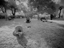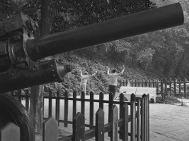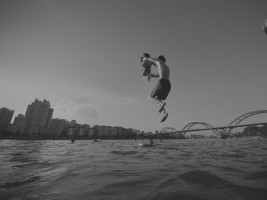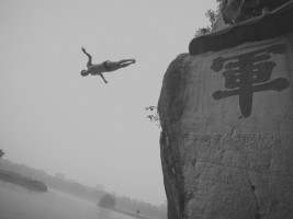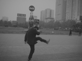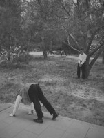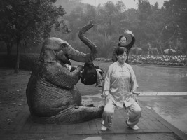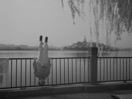 的确,贺肖华的这一组“逍遥”,果然就是从“裂缝”中窥得的人生。记得著名的摄影家盖里·维诺格兰德出道时有过一段疑问的过程:什么是一张好照片?一张照片究竟能够干什么?为什么一定要有一条稳定的地平线,或者相反?这些问题最终引申出来,就是他著名的公式:一切皆可被拍摄。那么,接下来的问题是,拍摄时的瞬间把握,究竟应该出现在那一个点上?在这之前,有了卡蒂尔—布列松的“决定性瞬间”,也有了罗伯特·弗兰克的“非决定性瞬间”,或者还有比如厄韦特倡导的在两者之间的缝隙中找到似是而非的瞬间。也许,贺肖华的尝试,可以归入后一种。这样的方式是伍迪·阿伦式的,带有机智、幽默和嘲讽,有如哲学的宏大却又简单明了。在看似匆忙的一瞥中,往往会给你意想不到的沉重一击。我们在阅读的过程中首先感到的是平淡无奇,接下来似乎可以找到一点幽默,但是实际上智慧的力量早在幽默之前。这是一种善于从司空见惯的现实生活中透露出来的智慧,甚至涉及伦理道德以至于政治的范畴。只不过延伸太远,怕会是引来不必要的“麻烦”?