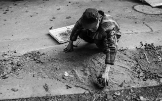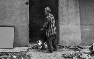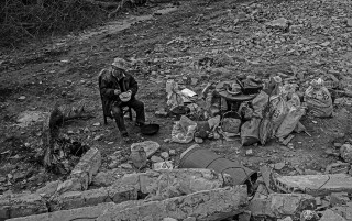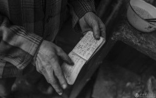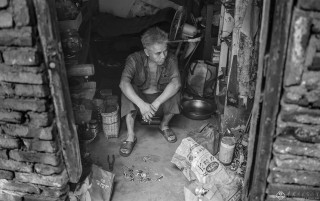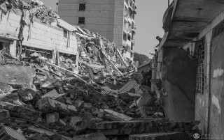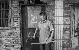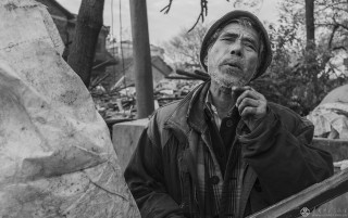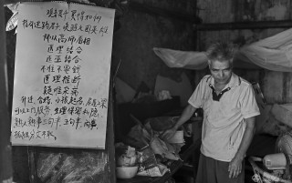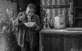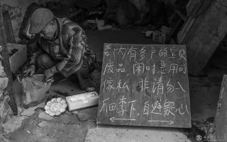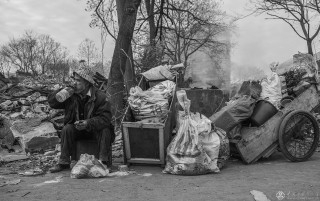 更多的房子倒下来了,我想抢在平政路消失前定格历史,去平政路的时间也更紧密。于是,那天一大早我远远便瞧见了曾三,他一个人孤寂地坐在旷野里,手里端着那熬出来黑乎乎地一碗粥,慢慢地咀嚼着生活的滋味。不知道是哪里得来的黑豆还是黑米,放在白色大碗里糊得不成颜色。后来我们才知道,就这样一碗粥确是他为数不多的一顿奢华的早餐。