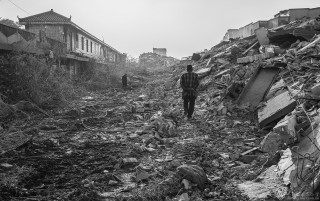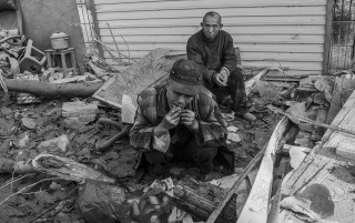 下午两三点,我们又遇到了曾三。彼时的他,软弱无力地蹲坐在地上,旁边是他刚从废墟里挖出来的全部家当。自早餐那一顿后,曾三再未吃过任何东西。我掏出五十元想让他救急,他却死活不肯接收。最后,我们的年轻摄影师王徉跑过了几条街买来了大袋饼干和大瓶水,曾三这才接过去狼吞虎咽。