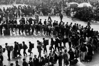 1984年1月14日,春节客运进入高潮后,北京站服务员带领乘客进站。马洪中 新华社