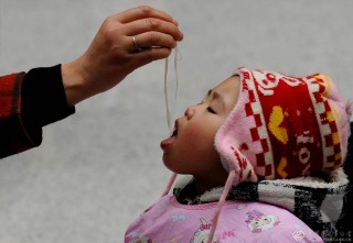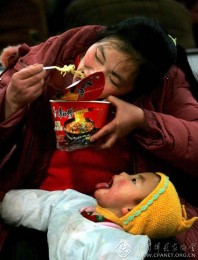 2010年2月1日,安徽合肥火车站候车大厅,一位母亲用手喂自己的孩子