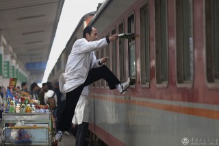 2007年2月23日,安徽合肥火车站站台上工作人员像玩杂技一般给乘客购物。