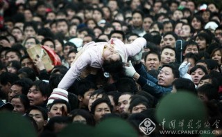 2008年 广州火车站一乘客晕倒,人们将其抬高送出。方谦华摄
