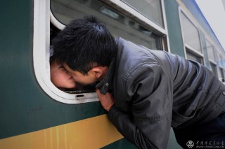 2010年2月5日,合肥火车站,一位父亲和自己的孩子吻别。