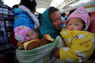 2011年1月9日,安徽合肥火车站,一位母亲背着两个孩子,艰难地登车