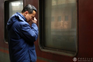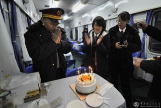 2014年1月17日,宁波至成都列车餐车里,列车员邹旭在一天最后几分钟内接受到同事的祝福,很激动