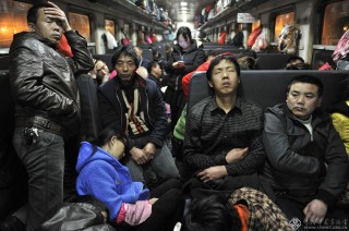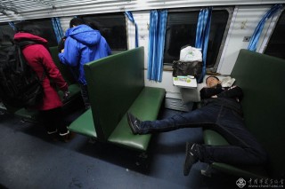 2014年1月18日凌晨,宁波至成都列车上,个个疲惫不堪,站着也能进入梦乡