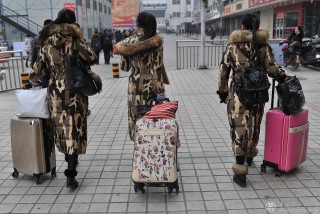 2015年2月3日合肥火车站广场,三个时尚的女孩赶车