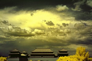 在这一组城市红外摄影作品中,云还是那片云,树还是那棵树,建筑还是那组建筑。但蓝天白云不见了,青葱翠绿不见了,红墙绿瓦不见了,取而代之的是斑斓的色彩充斥画面,有金黄、雾白、炫紫、宝石蓝与玫红等,林立的建筑在绚烂色彩的衬托下更显得别出心裁,金黄色的天空虽不合常情却又引人注目。