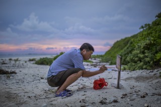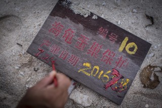 渔民符永波是海龟保护站的工作人员之一,每天他都会到海边巡逻,发现有新的产蛋痕迹,就会在一旁插上一块木牌,木牌上标注有产卵的编号和时间。