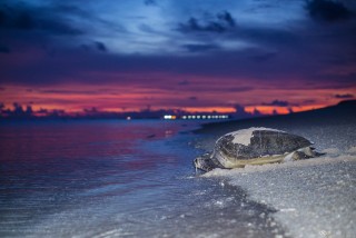 绿海龟产完蛋后,返回大海。海龟有个特点,就是它小时候从哪个沙滩孵化出来,等它成熟后,还会回到这个沙滩产卵。所以保护好海滩,就是对海龟最尊重保护。