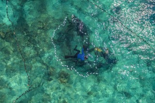 符家兄弟将小渔船驶到大的礁盘与礁盘之间,涨潮时鱼群会游进珊瑚礁,等退潮时,鱼群会游进礁盘之间,较深的海沟里。符家兄弟会在退潮时下网,等待一两个潮水周期后,再去收。此时,鱼儿们被围困在渔网里,符家兄弟就在这个心形的网中,潜水围捕。