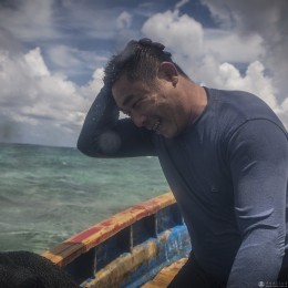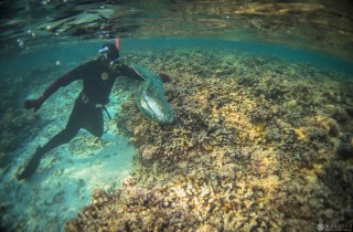 在赵述岛上,还有一些渔民会选择天黑出海。他们带着强光手电,口喊一根氧管,下潜二三十米深。这时,鱼群都在珊瑚礁盘里睡着了,如果用手电照射鱼的眼睛,它们会一动不动,相对容易捕获。