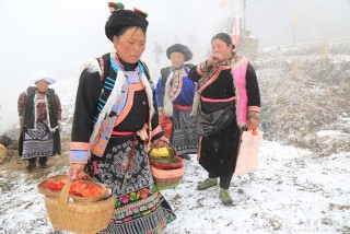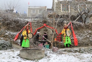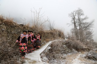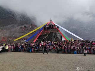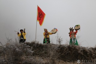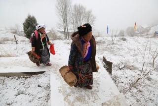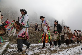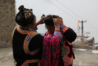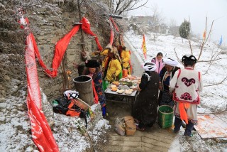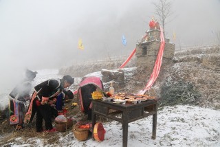 一大早,天空春雪飘飘,寒气袭人。来自全乡五个村的数百名群众身着节日盛装:男子穿着绣花白袍黑褂花布鞋,黑白布巾绑头,捆了灰白色绑腿;女子则是一身深色绣花的布裙,裹了绣花头巾,装扮一新,齐聚祭祀塔前。