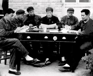 县长李贵(中)在红旗渠后勤指挥部带领大家学习 李红
