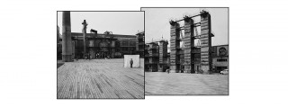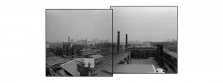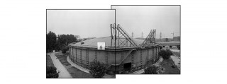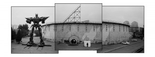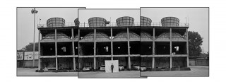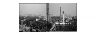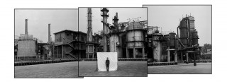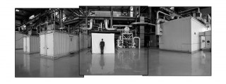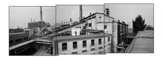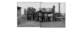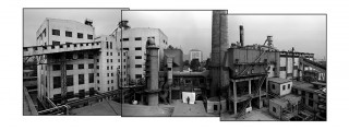 这一组照中,我注意到摄影师胡力在展示图片时,也还采取了将两至三幅照片进行接片的方式,且有意使连结处产生许许可错。这种方式,我愿意将虽然这种接片方式也试图为观看者展现”751厂”更为宽广恢宏的场景,但空旷无人的厂区,正可反衬出昔日热烈喧闹的社会主义大工业已是昨天的故事了。《站/工人/工厂》,黑白的影调,郑重的拍摄,感觉有悲壮在里面,有叹惜在里面,有见证在里面,当然也有面对庞然大物时的震慑。人置身其中,被宏大的工业吞,小若微粒,依依然顽强地存着着。