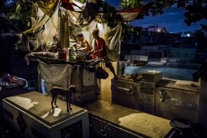 一名和家人住在帐篷里的男人。北马尼拉公墓埋葬了许多国家缉毒行动的受害者,该男人两岁大的双胞胎也埋葬其中。