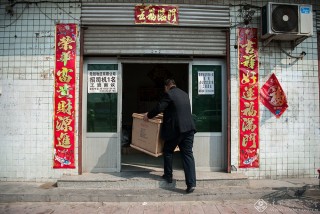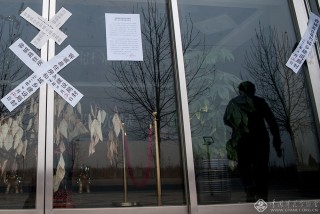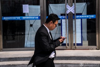 一名房屋中介的工作人员从贴有封条售楼处走过。4月3日下午,保定市土地分局、规划建设局、市场监督管理局、经济发展局、城镇建设管理办公司联合对白沟镇房地产中介公司进行贴条封锁,禁止交易。