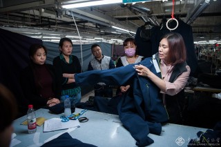 上班第一天,和阴金华同厂的刘红正在车间为员工在讲解服装加工的注意事项和品质要求。对于习惯了在小县城生活的她们来说,突然间变成新区人民,一切似乎都才刚刚开始。
