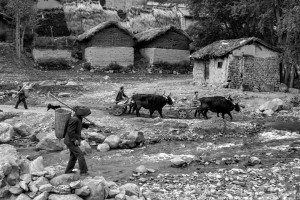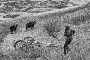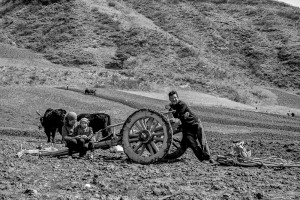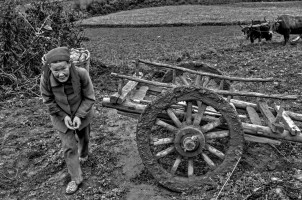 2014年10月7日拍摄于甘肃省宕昌县兴化乡磑子坝。木轮车已经慢慢地退出,取而代之是胶轮车,村庄也已不再是泥泞的山路,取而代之的是硬化水泥路,整齐的民房,一切都在变化中。